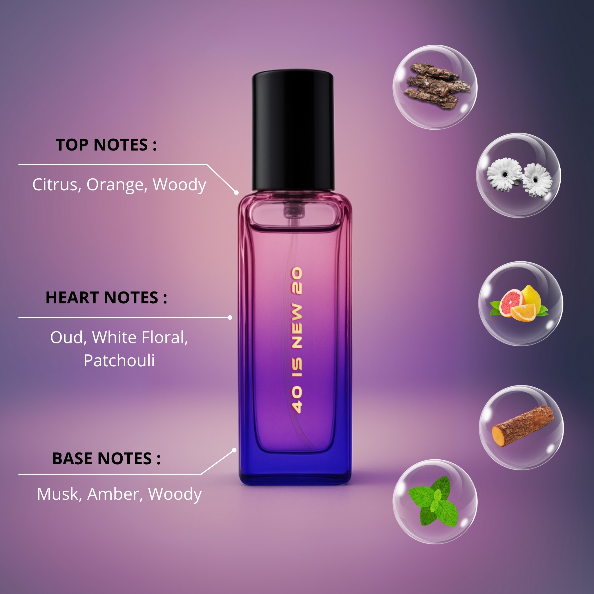 40 is New 20 is a unisex fragrance that challenges convention. With crisp citrus, deep oud, and soft floral undertones, this perfume blends freshness and strength in perfect balance. It’s bold, refined, and ageless — just like its wearer.