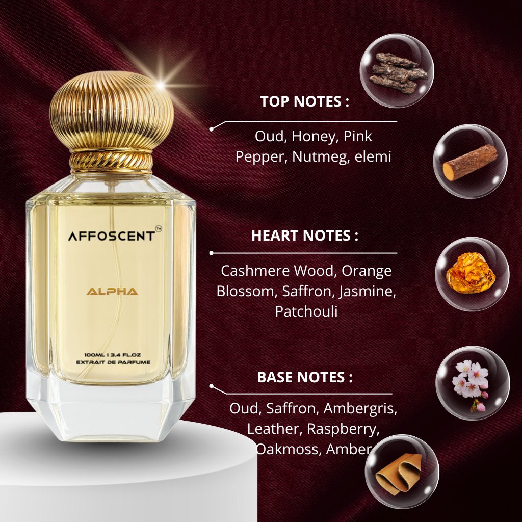 Alpha Unisex Perfume is crafted for those who naturally stand out — strong, confident, and unapologetically original. This fragrance opens with the rich warmth of oud and honey, infused with pink pepper and nutmeg that add a spicy spark. The heart reveals an opulent mix of cashmere wood, saffron, jasmine, and patchouli, blending seamlessly into a powerful base of amber, leather, and oakmoss.