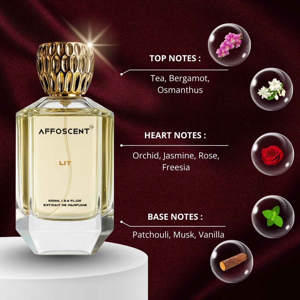Lit by Affoscent is a vibrant women’s perfume that blends freshness with floral warmth. It feels modern, confident, and uplifting — perfect for women who enjoy stylish everyday fragrances.