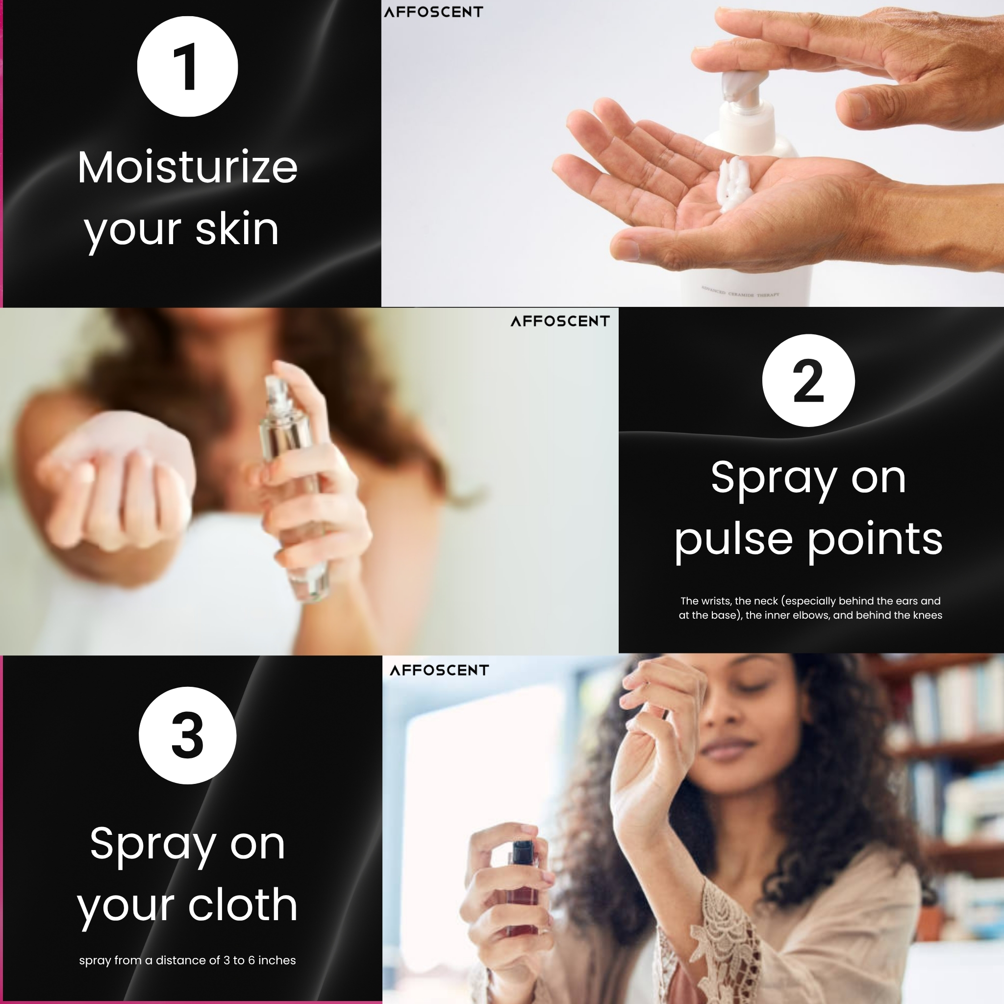 To get the most out of your fragrance, apply it to your pulse points—areas where the blood vessels are closer to the skin, which naturally radiate heat and help diffuse the scent.