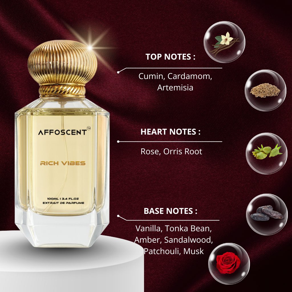 Rich Vibes Men Perfume combines the strength of oriental spices with the smoothness of creamy woods and amber. This scent speaks of ambition, style, and refined masculinity — ideal for men who appreciate bold fragrances with a smooth, classy finish.