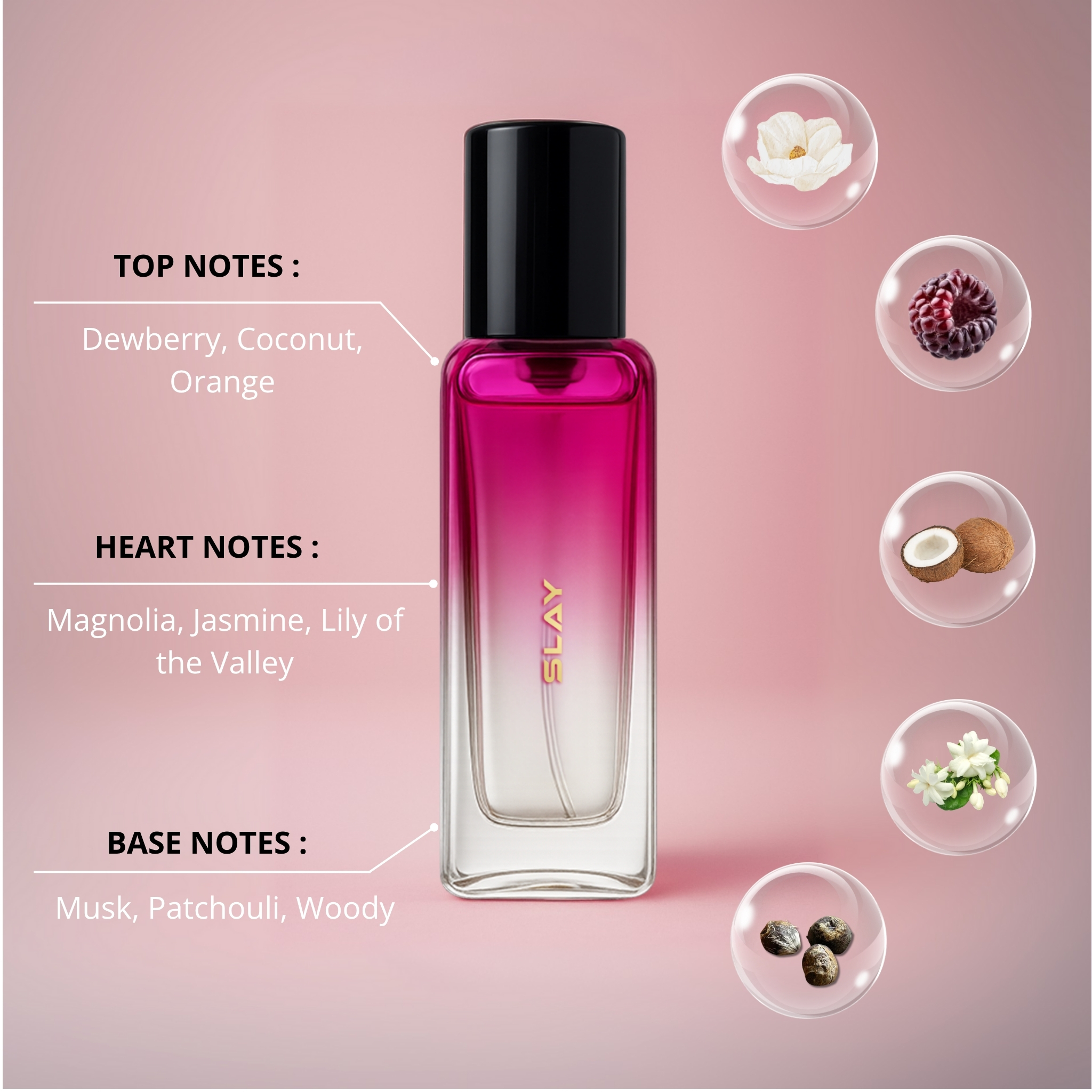 Slay is a vibrant perfume for women that opens with fresh magnolia and juicy fruit, moves into a romantic heart of orchid, rose, and muguet, and finishes with a soft yet grounded trail of musk, patchouli, and wood. It’s a floral fragrance with attitude — sweet yet sophisticated, airy yet intense.